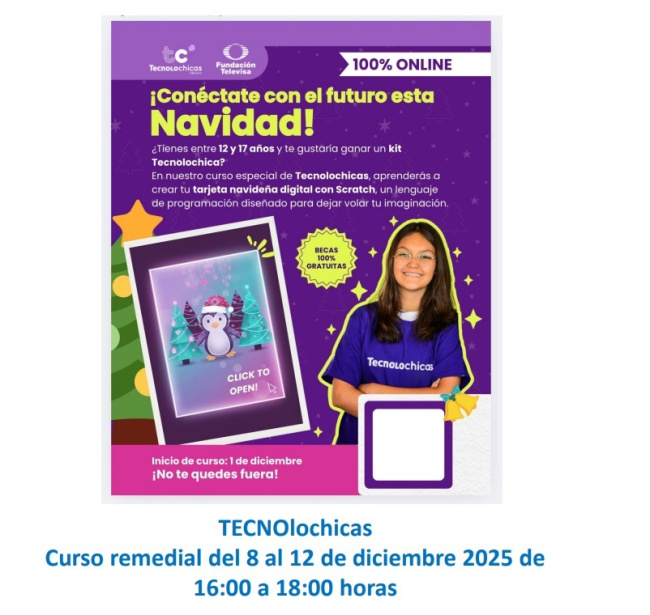 Para todas nuestras estudiantes se les hace una cordial invitación a participar en el curso especial navideño de Tecnolochicas, en el cual programarás tu tarjeta de navidad.